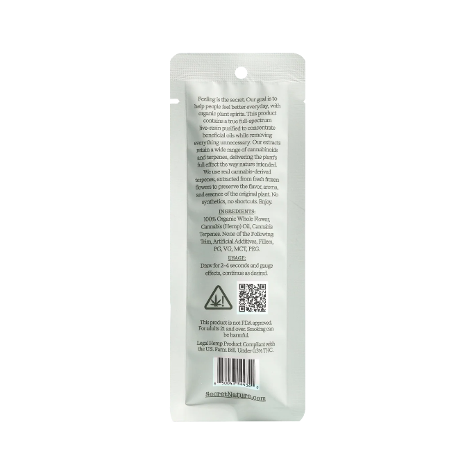 Premium, full-spectrum THCA live resin in a sleek, 1 gram disposable vape pen, crafted for connoisseurs who want purity, potency, and rich flavor straight from the plant. Secret Nature starts with organic, indoor-grown cannabis, extracted using clean CO₂ methods to preserve authentic cannabinoids and terpenes without synthetic additives or cutting agents. The result is a smooth, flavorful, true-to-strain experience with each puff — from uplifting sativas to deeply relaxing indicas. THCA naturally converts to Delta-9 THC when heated, delivering a genuine cannabis high that’s federally legal (≤ 0.3% Δ9 THC).