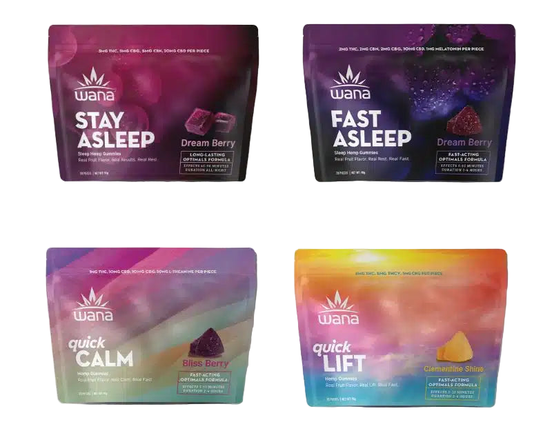 Vegan, gluten-free, and made with all-natural ingredients, some Wana gummies use a fast-acting nano-emulsion for effects in as little as 5–15 minutes, while others are classic 45–90 minute onset. Each piece is precisely dosed for consistent, balanced results and crafted with real fruit flavor.